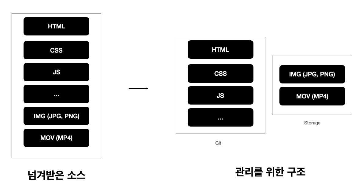 I tried to manage all code in git repository for deployment and source management, but the given sources included large amounts of images (.png, .jpg) and image files (.mp4) and I couldn’t include them in scm like git. That’s why these media files had to be placed separately in storage outside or inside the server, and only the remaining code had to be managed by scm.
