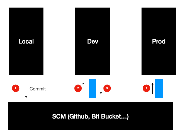 Basically, there are Local, Dev, and Prod enviornments and I put the pipeline which deploys to the server putting dev branch and masterbranch in Github.